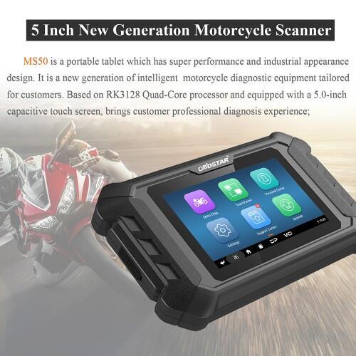 OBDSTAR MS50 es una tableta portátil que tiene un rendimiento superior y un diseño de apariencia industrial. Es una nueva generación de equipos de diagnóstico de motocicletas inteligentes diseñados para los clientes. Basado en el procesador RK3128 Quad-Core y equipado con una pantalla táctil capacitiva de 5.0 pulgadas, brinda a los clientes una experiencia de diagnóstico profesional.